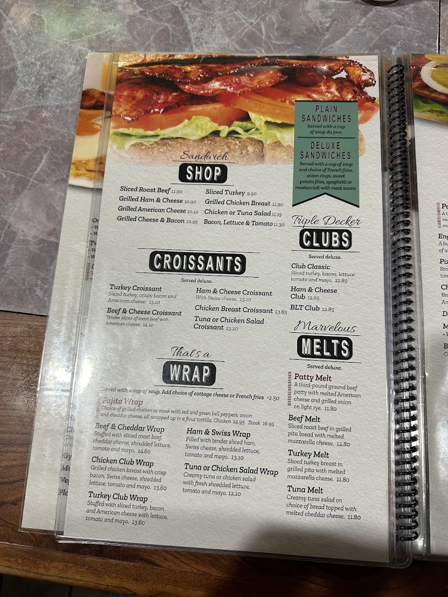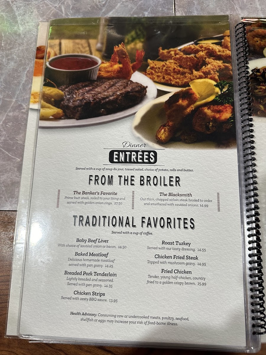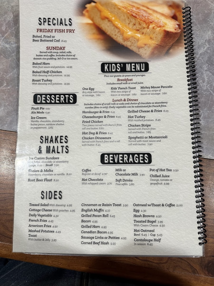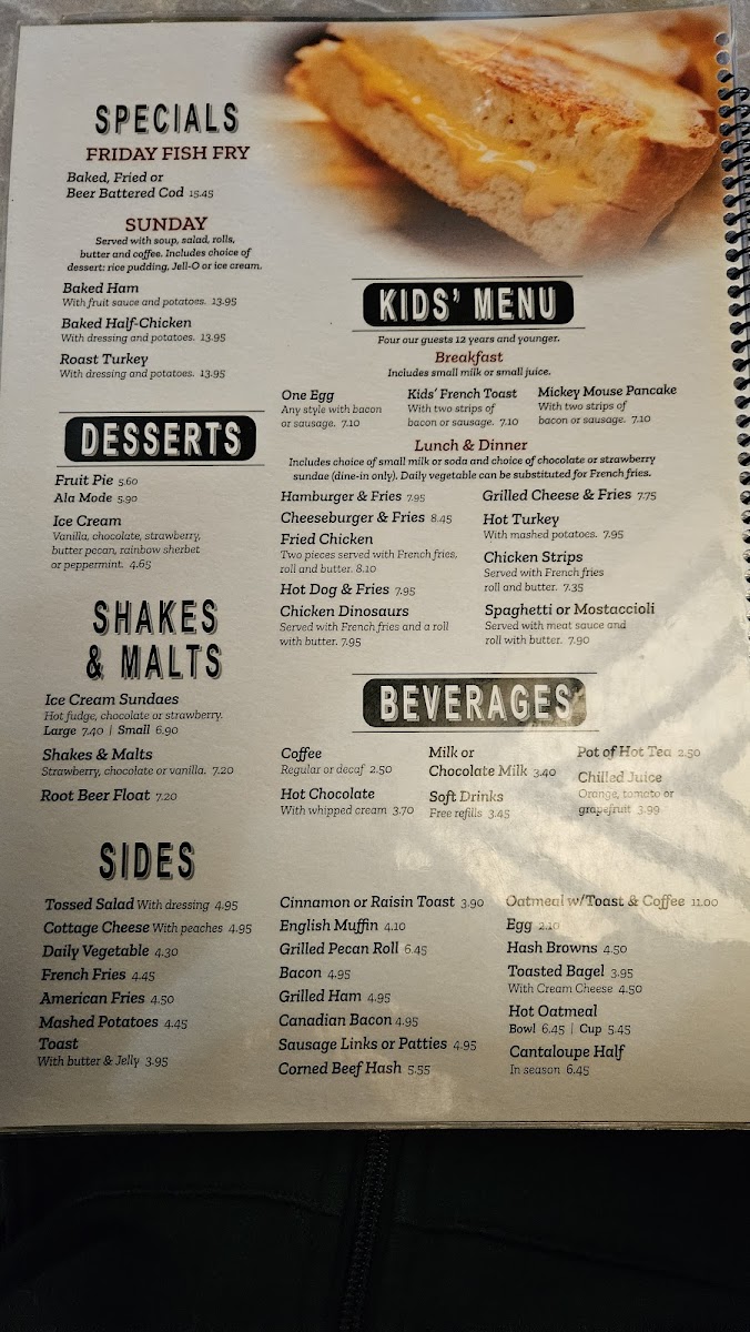 With dressing and potatoes. Served with soup, salad, rolls, butter, and coffee. Includes choice of dessert: rice pudding, Jell-O, or ice cream.