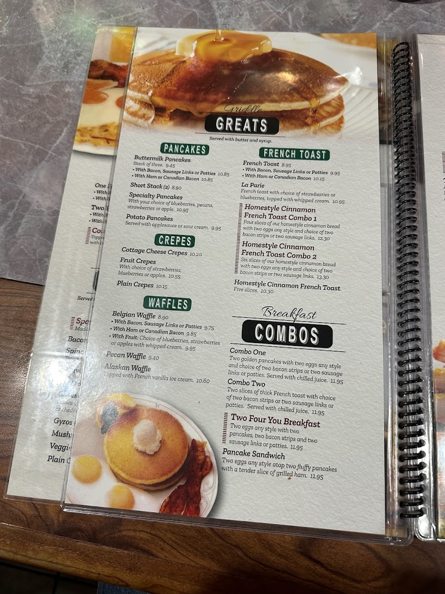 Four slices of our homestyle cinnamon bread with two eggs any style and choice of two bacon strips or two sausage links.