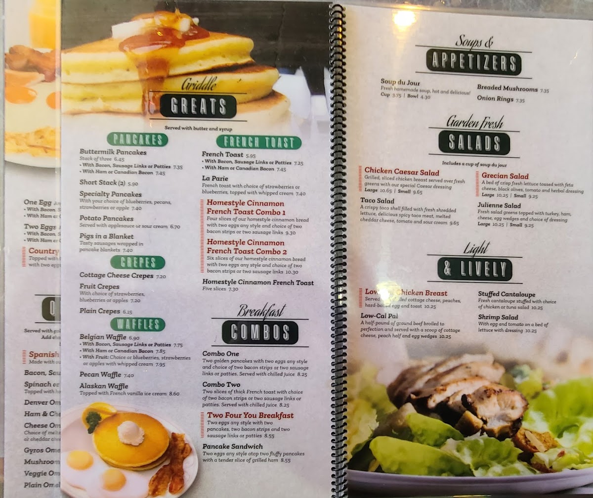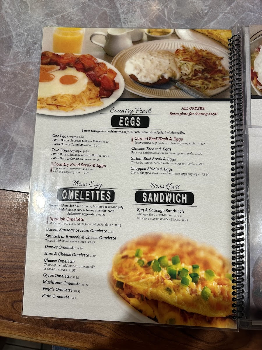 Six slices of our homestyle cinnamon bread with two eggs any style and choice of two bacon strips or two sausage links.